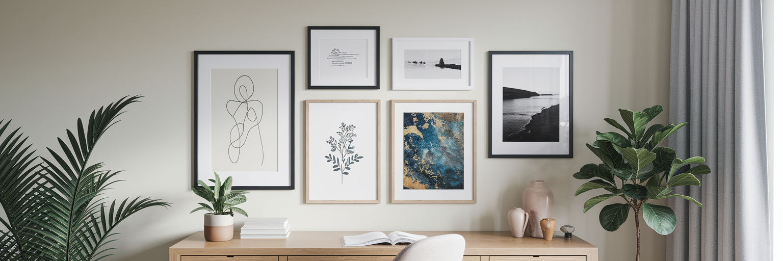 If you're inspired to create your own, you can find beautiful combinations in our gallery wall art collections. Here’s a stylish tip for those working from home for a company: you could even use a colour from your company's branding in a subtle, chic way through an abstract piece. It feels much more personal than a logo.