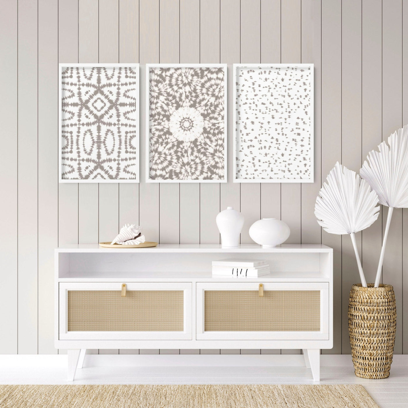 Some of my favourite gallery walls blend natural materials like rattan or driftwood frames with traditional white mats, softening the overall effect. When planning your layout, consider floating shelves within the gallery to include small coastal objects like a piece of sea glass or a miniature coral sculpture. These subtle touches introduce texture and warmth, grounding the wall art in the tactile world of the beach itself.