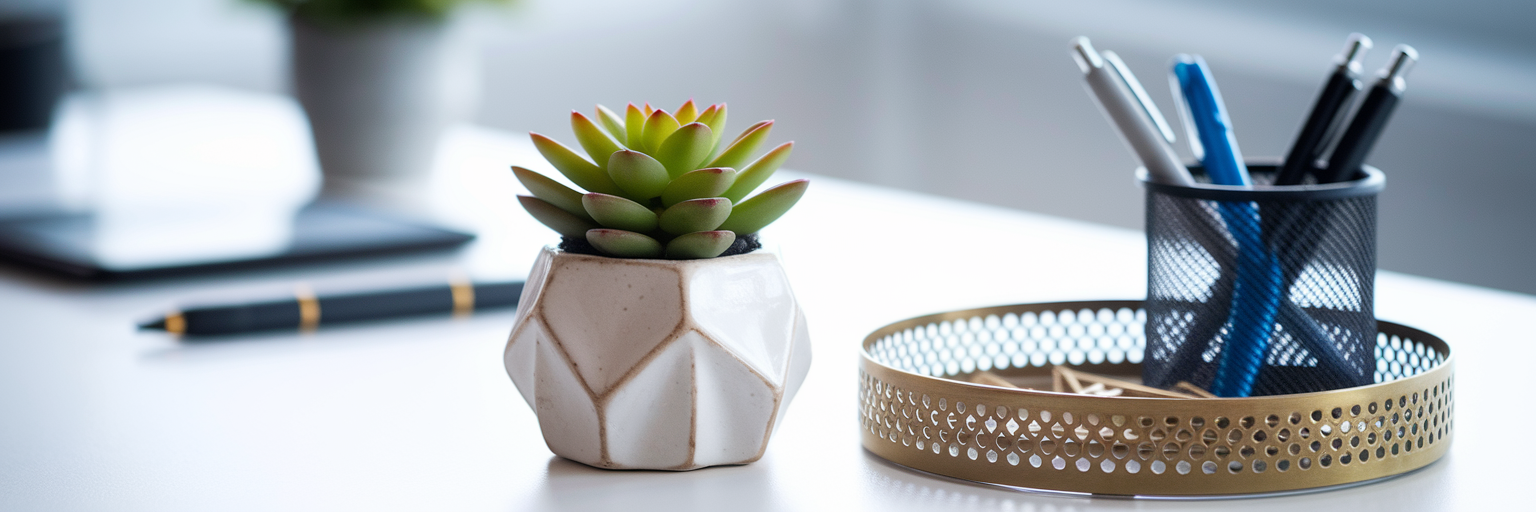 Think about stylish accessories that are also useful: an elegant stationery holder, a beautiful ceramic pot for your pens, or a small tray to keep keys and small items contained.
