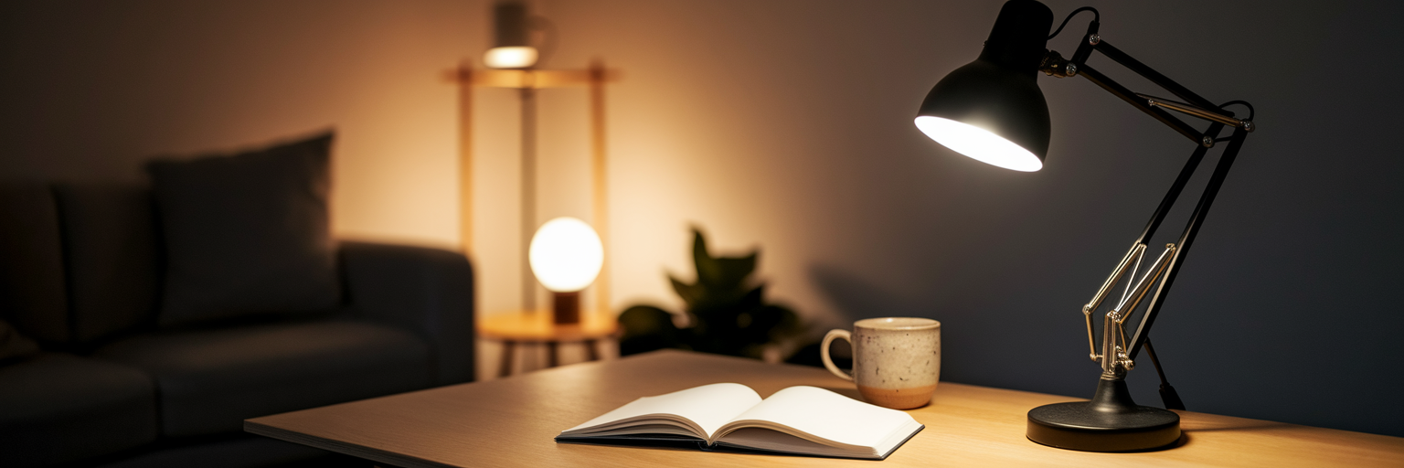 For task lighting, choose a desk lamp that is also a beautiful object. A sculptural lamp in brass or a pop of colour can become a design feature in its own right.
