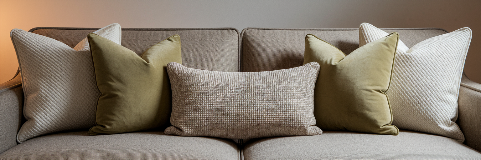 For textiles, try arranging five cushions on your sofa. A classic approach is two matching pairs and one unique feature cushion in the middle to add a pop of personality.