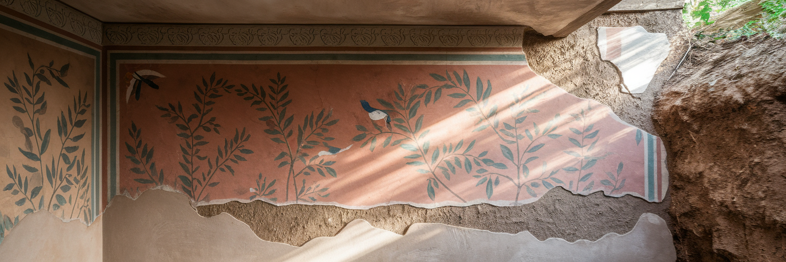 Roman villas, from Pompeii to the ones we find here in Britain, were adorned with scenes of mythology, landscapes, and daily life. The colours they used—rich terracotta, earthy ochre, and deep black—are timeless.